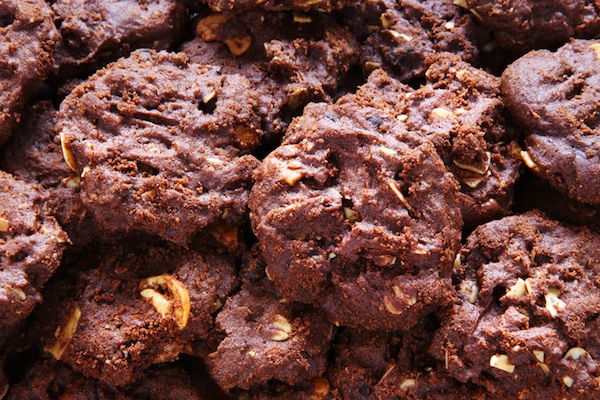 In una terrina montate il burro con lo zucchero, poi incorporatevi l’uovo, la farina, lo zucchero vanigliato, il sale, il bicarbonato. Poi grattate il cioccolato in scaglie e tritate finemente le mandorle mescolando fino ad ottenere un impasto omogeneo.